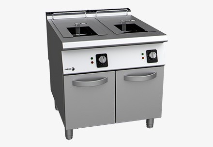 FAGOR gáz üzemű olajsütő. Űrtartalom 2x21 liter. Fedlap vastagság 2 mm AISI- 304. Termosztatikus vezérlés 60–200 °C.